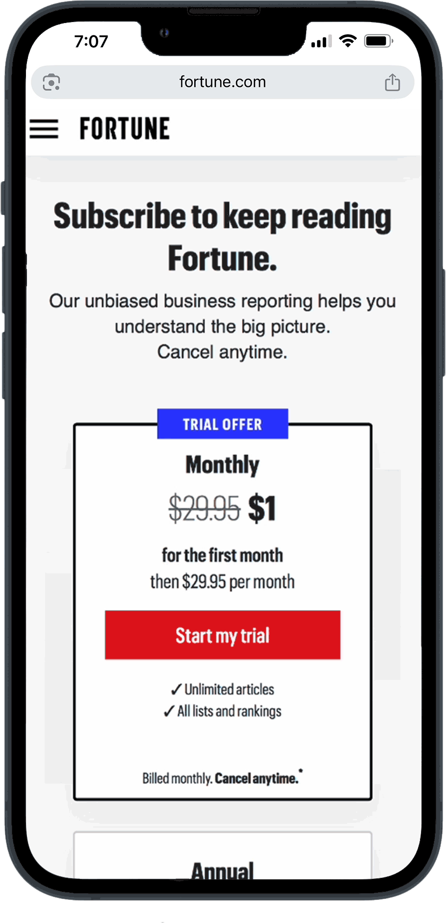 When I joined Fortune, the subscriptions landing page had not been updated in over a decade. From a UX perspective, there were two main issues I needed to tackle: firstly, the subscription boxes were too tall, pushing most of the content below the first screenful on mobile, and secondly, there was no information whatsoever about the subscription tiers, which resulted in unnecessary customer service requests.